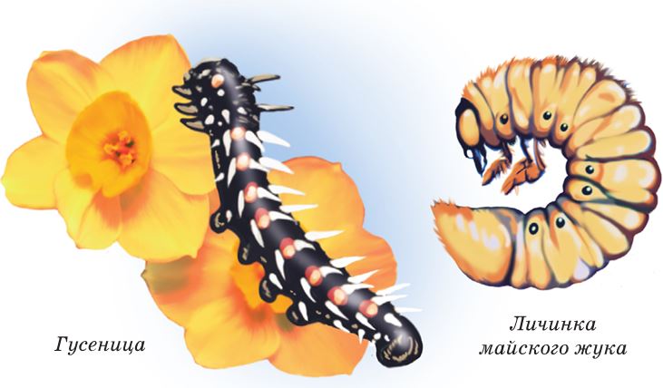 Впрочем, гусеница (личинка бабочек) имеет обычно либо восемь, либо пять пар ножек. Первые три пары не вполне развиты (они укорочены), это и есть шесть ног будущей бабочки; остальные – так называемые ложные ножки. Спереди у гусеницы настоящие ноги с коготками. А в задней части тела – особые выросты, работающие как щипчики. Гусеницы – растительноядные существа, они сидят на листьях, ветках, без этих вспомогательных щипчиков им было бы трудно удержаться. У бабочек, которые появятся потом из этих гусениц, ложные ножки исчезнут. Личинки многих жуков развиваются в почве или под корой деревьев, в древесине. Им не надо удерживаться за качающиеся на ветру листья и ветки, у них нет ложных ножек, а только шесть настоящих. Личинки некоторых жуков могут иметь укороченные шесть ног, а бывают и совсем безногими.