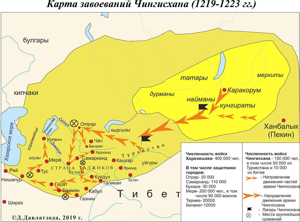 Известный арабский путешественник Ибн Батута, побывавший в Мавераннахре через сто лет после нашествия монголов, так описал увиденное: после ожесточенных боев Чингисхана с сыном Хорезмшаха султаном Джалаладдином этот процветающий край был превращен в руины, из красивейших городов – Бухары, Самарканда, Термеза, – до единого уничтожив население, молодых увели в плен и полностью опустошили страну[99].