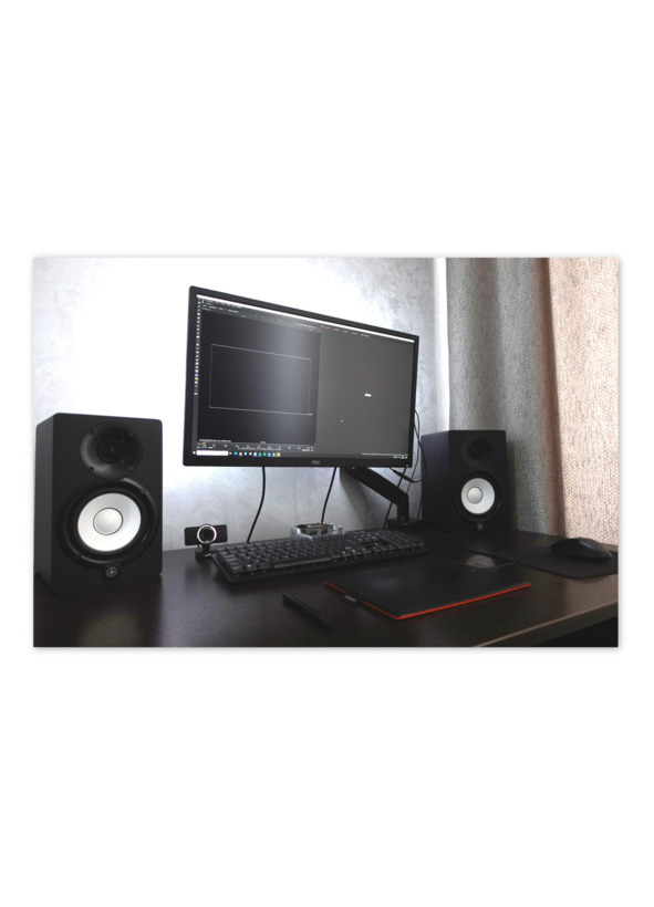В комнате у меня два компьютера, роутер с гигабитным интернетом, NAS с поддержкой RAID 1, и он же выполняет роль FTP-хранилища, панель для цветокоррекции Blackmagic Design, а также мои любимые колонки Yamaha. Я обвязал интернет и мои компьютеры с NAS через коммутатор. На первом компьютере я работаю в программе Nuke, а на втором супруга делает лайтинг и рендер в Houdini FX. Конечно же, работаем и в других ПО, но о них чуть позже.