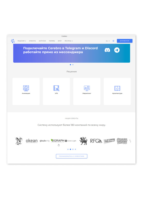 Для передачи и приема материалов из FTP мы используем Filezilla. Управление проектами у нас идет в сервисе Cerebro. Кстати, наш логотип студии есть у них на главной странице сайта.