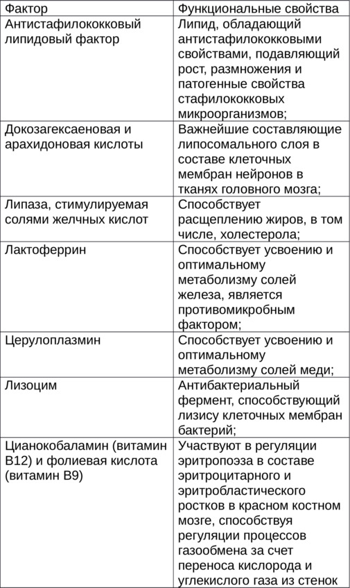 В нижеследующей таблице приведен краткий обзор особых веществ-факторов, присущих для состава женского грудного молока: