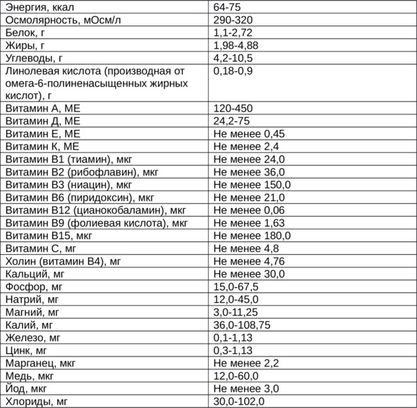 Упомянем важные принципиальные критерии о том, что женское грудное молоко в ходе своего формирования в послеродовом процессе проходит три стадии метаморфоза: молозиво (секрет, выделяемый молочными железами в первые 3—4 дня после родов при стимуляции первичного лактационного секрета), переходное молоко (появляющееся с 4—5 дня- до 2-3-й недели после родов) и зрелое женское грудное молоко (созревающее с 2-3-й недели после родов в процессе естественного вскармливания новорожденных). Средняя калорийность зрелого женского грудного молока, по разным расчетам, составляет 65—70 ккал/100 мл продукта.