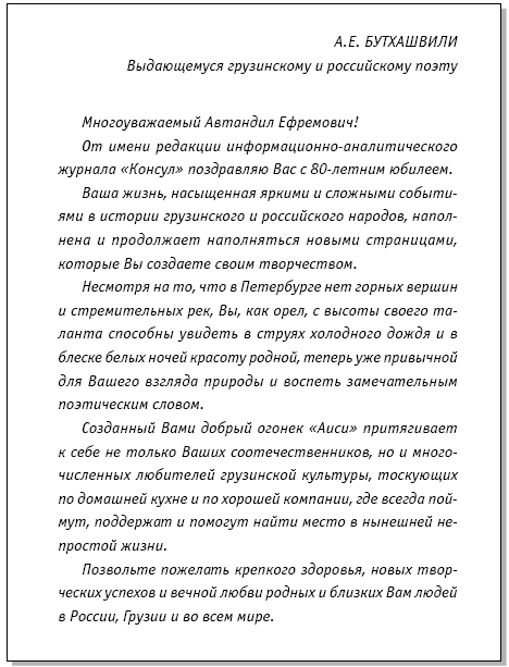 Ваша жизнь, насыщенная яркими и сложными событиями в истории грузинского и российского народов, наполнена и продолжает наполняться новыми страницами, которые Вы создаете своим творчеством.