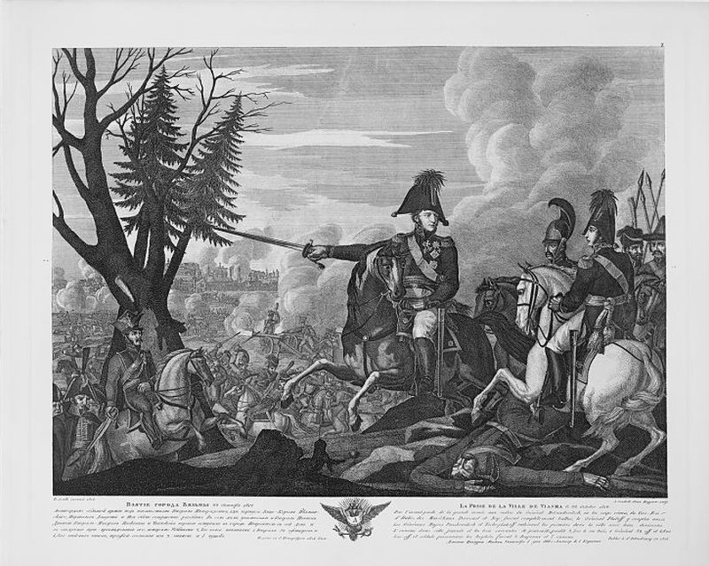 Генерал Бараге-Дильер командовал дивизиею, составлявшеюся в Смоленске. Он расположил войска свои на дороге, идущей из Смоленска в Ельню. Приближение по сему направлению российской армии долженствовало обратить его к соединению своей дивизии. Он сего не сделал; 28-го октября (9-го ноября) трое русских партизан атаковали одну из бригад его, которая, невзирая на силу свою, простиравшуюся до тысячи ста человек пехоты и пятисот конницы, положила оружие. Остальная часть дивизии едва успела скрыться в Смоленске. Партизаны взяли также многие французские депо, из коих главнейшее было в Клементьеве[32]. Большая часть лошадей, употребленных для возки фур и расположенных на квартирах в окрестностях Смоленска, но в дальнем расстоянии от сего города, попались также в руки казакам.