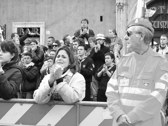 Перед входом на Площадь святого Петра, на Виа делла Кончилиационе («Это улица „Умиротворения“, построенная Муссолини и названная в честь водворения мира между Италией и католической Церковью», – объяснял мне на ходу Витторио) уже собралась огромная толпа. Здесь даже ночью было несколько сотен тысяч людей. Мы остановились среди португальцев, которые, чтобы согреться и не уснуть, пели под гитару португальские религиозные песни. Звучало психоделично – как последний трек с альбома Pink Floyd «Obscured by clouds». На бампере кем-то опрометчиво оставленной здесь легковушки расположились поляки – две или три семьи, и пили чай, глядя вокруг красными от бессонницы глазами.
