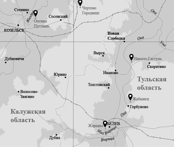 Но только надо иметь в виду, что со всякого рода богами и бесами мы сталкиваемся далеко не всегда и не во всяком месте. В местах силы этих контактов больше всего. А лучшее время для явления невидимых сущностей – солнцестояния: зимнее58 (Святки) и летнее59 (Купала). Сейчас как раз летнее солнцестояние, поэтому неплохо знать место, где бы удобно было предаться купальским грехам. Предлагаю рассмотреть урочище Жаровка. Это практически в черте города Белева Тульской области, в самом конце улицы Садовой, на окраине около кладбища.
