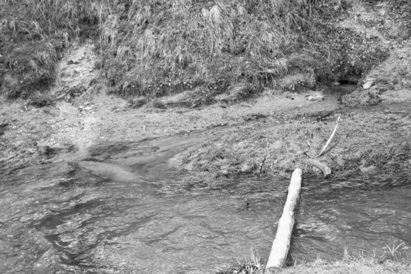 берега. Здесь видны два выхода воды: слева, где песочек, и справа, куда указывает бревно