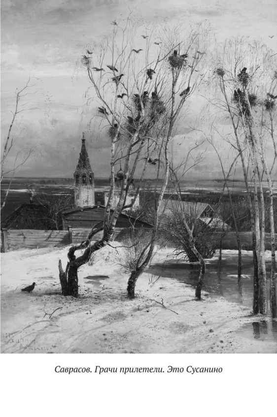 Некоторое время назад, путешествуя по Костромской области, я увидал с дороги колокольню, которая показалась мне очень знакомой. Подъезжать к ней я не собирался, поскольку у меня кончились рубли, кончался бензин, а поменять доллары представлялось возможным лишь в Костроме. Туда и спешил, уже не надеясь доехать… Но на ближайшем повороте обнаружился указатель с надписью «Обмен валюты». Так я оказался в райцентре Сусанино, около замеченной мной издали церкви. На ней висела табличка, извещавшая, что художник Саврасов изобразил эту церковь на картине «Грачи прилетели». Обойдя церковь слева, я увидел на ней еще одну табличку: «Музей подвига Ивана Сусанина».