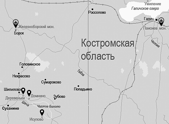 Предыстория такова. После того как в ноябре 1612 люди Минина и Пожарского взяли Московский Кремль, Миша Романов и его мать Ксения Ивановна, пережившие ужасы осады вместе с поляками, отправились в Кострому. В хорошо укрепленном городе им ничего особенно не угрожало, но мать и сын хотели побывать в своем родовом гнезде Домнино, расположенном примерно в 60 километрах на север от Костромы. А потом посетить Макарьев монастырь на Унже63 (от Домнина это только по прямой больше 130 км), чтобы помолиться преподобному Макарию, который считается покровителем пленных64. Дело в том, что глава их семейства Федор Никитич Романов был тогда в польском плену.