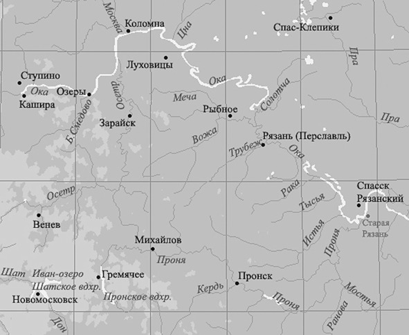 Может, и были, да только их не интересовали ни Рязанская земля, ни люди, которые на ней жили. Интересовал их конкретно участок Оки от Коломны (то есть от устья Москвы-реки) до Старой Рязани, где в Оку впадает Проня. Дело в том, что Проня своим истоком почти соприкасается с Иван-озером, которое было тогда истоком Дона8. Одного взгляда на карту достаточно, чтобы увидеть, что были здесь и другие переходы с Оки на Дон, но путь по Проне был самый удобный. А ключом его была Рязань, бойкий торговый перекресток (при раскопках там найдены даже римские мечи). И, конечно, в эти места всегда тянулись щупальца торговых держав. Со средины 9-го века именно здесь проходила граница Хазарского каганата9. После того, как в 965 году киевский каган Святослав Игоревич покончил с Хазарией, на Оку пришел капитал с Днепра, поддержанный, ясно дело, военной силой.