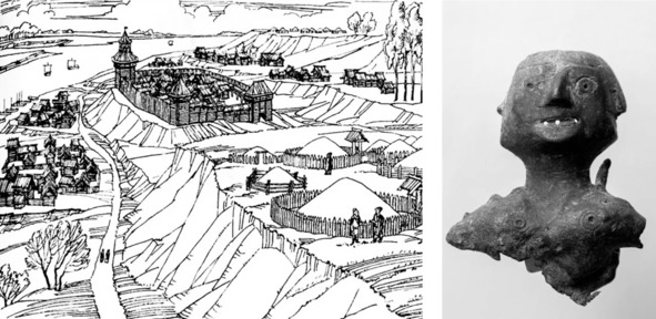 Слева реконструкция первой Рязанской крепости (примерно 1100 год). К приходу Батыя город сильно расширился и занимал уже все территорию, которая помещается на этом рисунке (а также пространства, которые не помещаются). Справа идол, найденный на месте Спасского собора, главного храма древней Рязани. Там было капище,