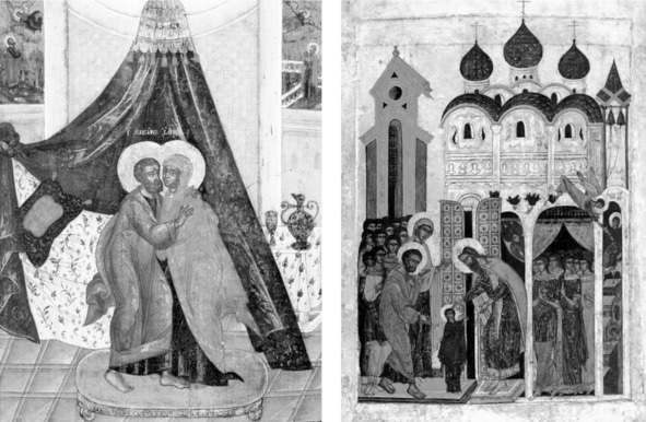 Слева икона Зачатие. Анна и Иоаким на фоне открытого алькова. По бокам, как бы в окнах, ангел сообщает по отдельности Анне и Иоакиму, что у них будет ребенок – дочь Мария. А справа икона Введения во храм. Те же Анна и Иаким отдают свою трехлетнюю дочь в руки жреца еврейского бога. Позади жреца очень верно изображены другие храмовые девушки, еще раньше отданные во служение богу