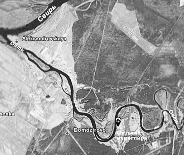 Оятское место силы из космоса. Характерно для места силы: около него река делает несколько резких излучин. Монастырь стоит на левом берегу Ояти, село Мандера, где жили Степан и Васса, стояло на правом. Теперь его нет. Но там стоит крест