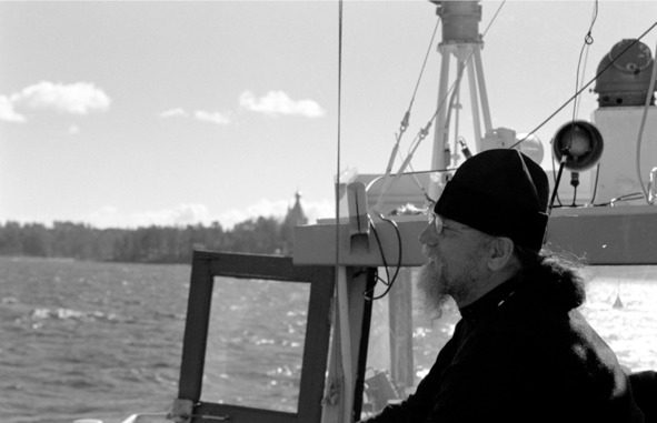 Путь на Валаам. Остров находится в северной части Ладожского озера. Сейчас туда ездят из Сортавалы. Я уже рассказывал об этом пути (см. Том Первый, Место десятое – Коневец) и еще расскажу об острове. На этой фотографии кораблик уже приближается к Валааму, вон видны его церкви. Монах блаженствует. Между прочим, он везет на остров каких-то ребят