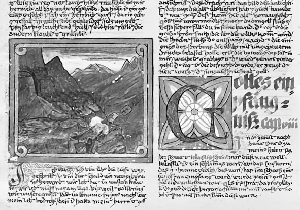 Страница из «Красной книги». Это пролог. Он называется «Путь того, кто грядет». Все нарисовано и написано рукой Юнга