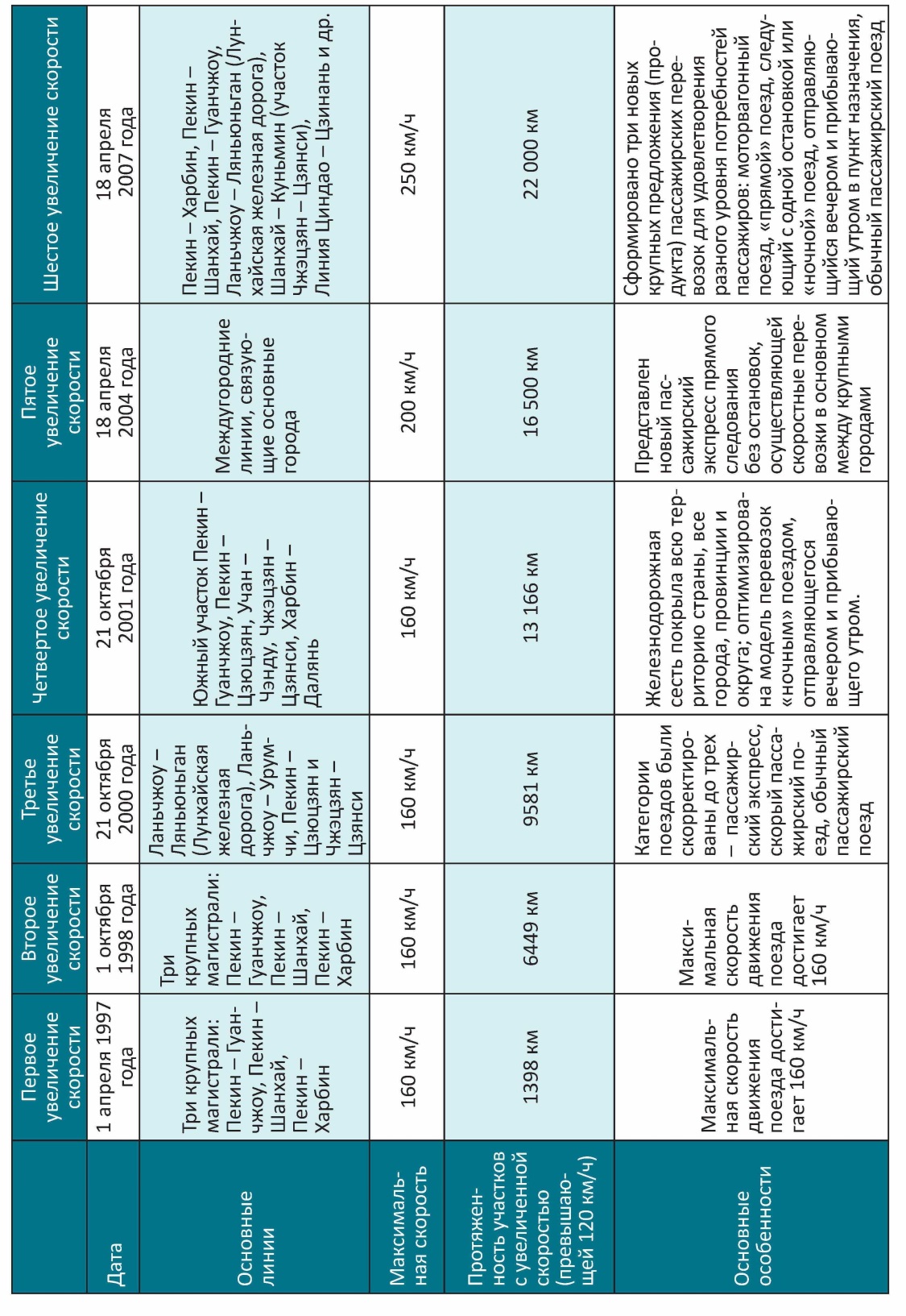 18 апреля 2007 года китайские железные дороги приступили к шестому этапу увеличения скоростей. На 6003 километрах железнодорожных линий Пекин – Харбин, Пекин – Шанхай, Пекин – Гуанчжоу, Ланьчжоу – Ляньюньган, Шанхай – Куньмин (участок Чжэцзян – Цзянси), Циндао – Цзинань и других скорость движения поездов достигла 200 км/ч, а на части отрезков она может достигать и 250 км/ч. Протяженность линий с допустимой скоростью, превышающей 120 км/ч увеличилась до 22 000 километров, железнодорожная сеть полностью покрыла большую часть городов, округов и провинций, провозная способность пассажирских и грузовых поездов возросла на 18% и 12% процентов соответственно. Увеличение скоростей в этот раз не только ознаменовало собой попадание китайских железных дорог, в частности уже построенных линий, на которых увеличили скорость, в первые ряды железных дорог мира, но и во многих аспектах КЖД оказались новаторами и первооткрывателями в области мировых железных дорог. Во-первых, на загруженных магистралях скорость была увеличена до 200 км/ч, протяженность этих реконструированных линий за один раз возросла до 6003 километров, на отдельных участках скорость достигла 250 км/ч, и неважно, шла речь об общей протяженности линий, на которых скорости разом подняли до 200 км/ч или о самых высоких скоростных показателях, по обоим параметрам китайские железные дороги шли в первых рядах, впереди железных дорог других стран. Во-вторых, на отдельных участках линий Пекин – Шанхай, Шанхай – Куньмин (участок Чжэцзян – Цзянси), Циндао – Цзинань и других основных магистралей пустили моторвагонные поезда, развивающие скорости от 200 км/ч и выше, и грузовые поезда, способные перевозить 5500 тонн грузов и двухъярусные контейнерные поезда – такое в мировой железнодорожной практике произошло впервые! В-третьих, одновременное движение по загруженным магистралям пассажирских и грузовых поездов, в условиях высокой интенсивности движения, и при плотности отправления моторвагонных поездов, развивающих скорости выше 200 км/ч, это исключительный уникальный способ организации перевозок в железнодорожной отрасли в мире.