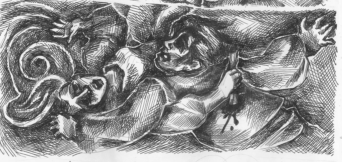В ответ студент только рассмеялся, схватил девушку и попытался повалить её на пол и сорвать с неё одежду. Студент был очень силен, и девушка не смогла бы долго сопротивляться. Некоторое время они боролись стоя у стола. Вдруг девушка нащупала на столе неизвестно откуда там взявшийся острый нож и изо всей силы ударила колдуна в спину.