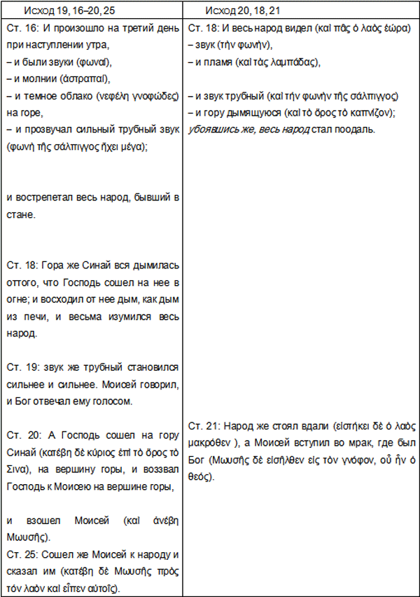 Эти пункты сопоставления соответствуют различным текстам. Восхождение Моисея включено в рассказ о Синайском Завете в 19, 9–20 и 20 главах Исхода. Вторая версия Синайского Богоявления дается в конце 20-й главы, стихи 18 и 21.