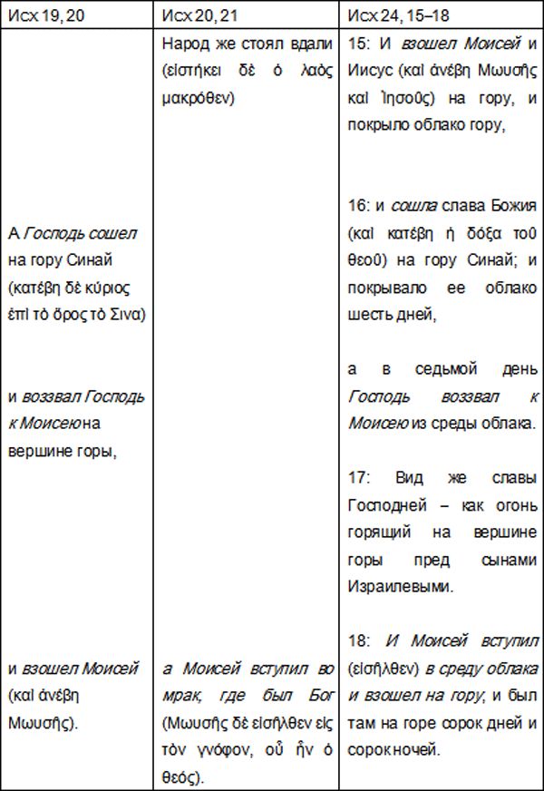 Исх 19 представляет собой диалог между Господом и Моисеем, тогда как Исх 20, 18–21 описывает поведение народа, который «стоял (εἱστήκει) вдали», и Моисея, который «вступил» (εἰσῆλθεν) во мрак.