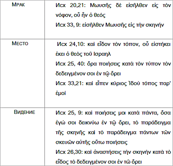 Следует упомянуть еще два места из книги Исход, а именно – 25-ю и 26-ю главы, где содержатся повеления, касающиеся построения святилища и одежд священников, столь пространно комментируемые Филоном Александрийским и Григорием Нисским, а также 33-ю главу о скинии собрания и молитве Моисея, которая есть одновременно заступничество за народ и мольба о том, чтобы узреть славу Божию. Два стиха из этих глав используются в рассказе о Богоявлении в Исходе как у Филона и Григория, так и у Дионисия. Это Исх 25,9, об образце (παράδειγμα), и Исх 33,21, о месте (τόπος):