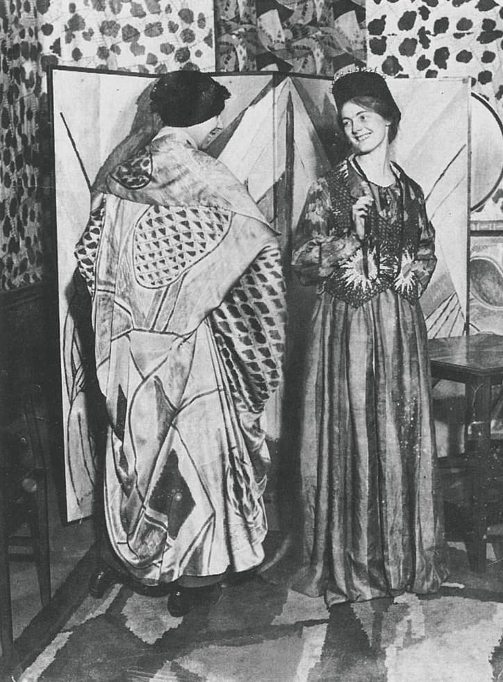 82 Нина Хэмнетт и Уинифред Гилл позируют в эффектной одежде ателье «Мастерские Омега» с яркими крупными узорами перед картиной Ванессы Белл Купальщицы на фоне пейзажа (конец 1913 года). Художники, участвующие в деятельности «Омега», верили, что искусство должно быть спонтанным и быть частью повседневной жизни, поэтому создавали одежду и предметы интерьера, вторившие колориту и модернистскому духу своих картин.