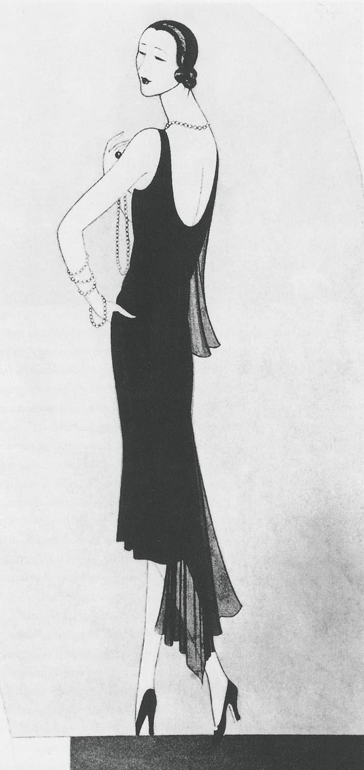 84 Черное вечернее платье от Шанель, 1926 год. В 1919 году Шанель утвердила моду на черный цвет: семь лет спустя американский журнал Vogue (октябрь 1926) опубликовал рисунок черного крепдешинового платья с защипами спереди с подписью «Форд от Шанель – платье, которое будет носить весь мир». Линии этого сдержанного платья без рукавов, разработанного в том же году и представленного на страницах журнала Harper’s Bazaar, смягчены двумя шлейфами, один из которых тянется ниже основного подола.