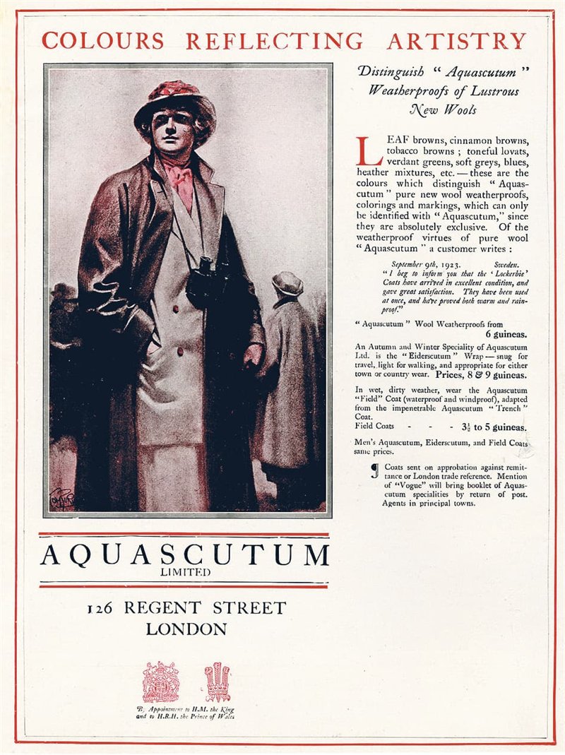 87 Реклама одежды Aquascutum, 1930-е годы. Эта британская фирма была основана в 1851 году портным Джоном Эмари. Ее название составлено из двух латинских слов: aqua – вода и scutum – щит. Эмари запатентовал первую водонепроницаемую ткань в 1853 году. К 1930-м годам компания была поставщиком функциональной верхней одежды для вооруженных сил, а также обеспечивала ею состоятельных гражданских модников.