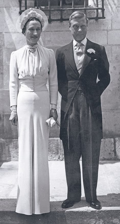89 Герцог и герцогиня Виндзорские в день своей свадьбы в замке Канде, Франция, 1937 год. Для создания своего приданого герцогиня выбрала американского по происхождению кутюрье из Парижа Мейнбокера, известного своими изысканными и элегантными моделями. Ее свадебный ансамбль – скроенное по косой платье и костюмный жакет из шелкового голубого крепа – задал моду на оттенок цвета, получивший название «голубой Уоллис». Шляпку в тон создала знаменитая парижская модистка Каролин Ребу. Герцог был одет во фрак из черного кашемира в елочку от лондонского портного Фредерика Шольте, серый жилет, рубашку в бело-голубую полоску с белым воротничком, шелковый галстук в бело-голубую клетку и шерстяные брюки в серую полоску с талией в американском стиле от лондонской фирмы Forster & Son.