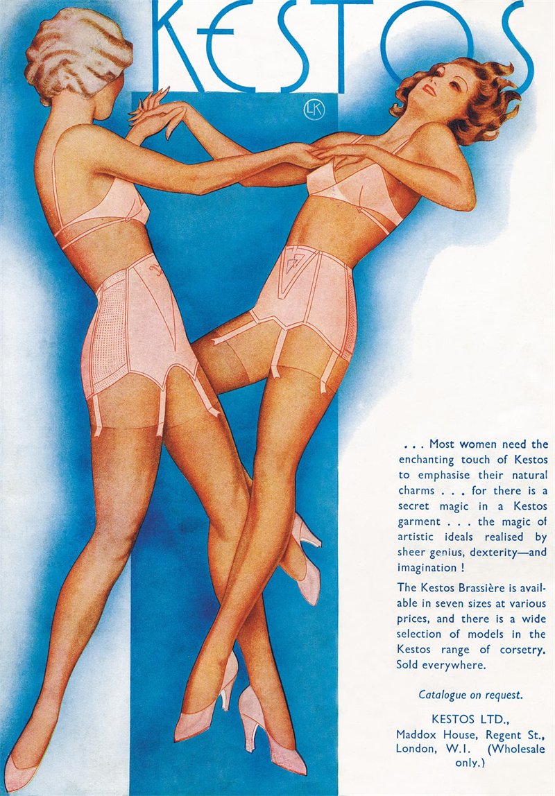 90 Реклама бюстгальтеров и корсетов Kestos, 1934 год. Компания Kestos была основана в 1925 году уроженкой Польши Розалиндой Клин. Ее главным достижением стал дизайн бюстгальтера с двумя чашечками, который она запатентовала в 1926 году и рекламировала как идеально подходящий для активного образа жизни. Он оставался очень популярным на протяжении 1930-х годов.