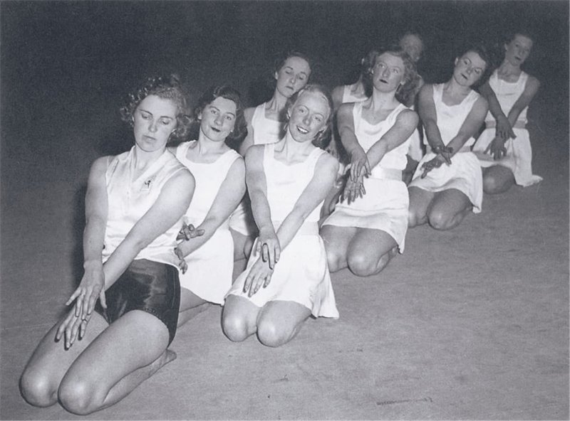 91 Женская лига здоровья и красоты репетирует шоу в Лондоне, 1930-е годы. Участницы одеты в современную, повторяющую контуры тела спортивную одежду.