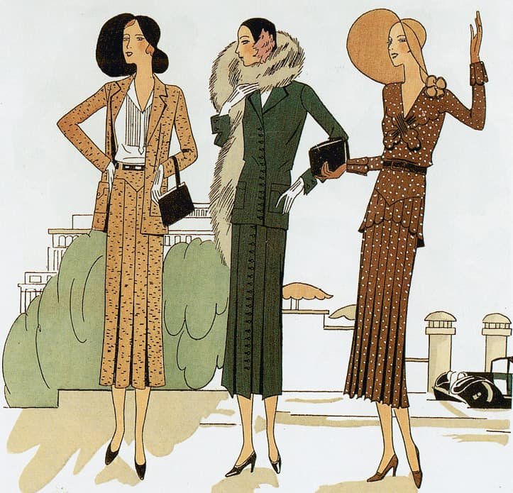 93 Модели повседневной одежды, зима 1930 года, в которых виден новый силуэт с завышенной талией и более длинным подолом. Слева и в центре: два ансамбля от Жана Пату – «Пуллман», утренний костюм из крепдешина, и костюмный ансамбль «Круизер». Справа: «Гамин», утреннее платье из шерсти от модного дома Premet.