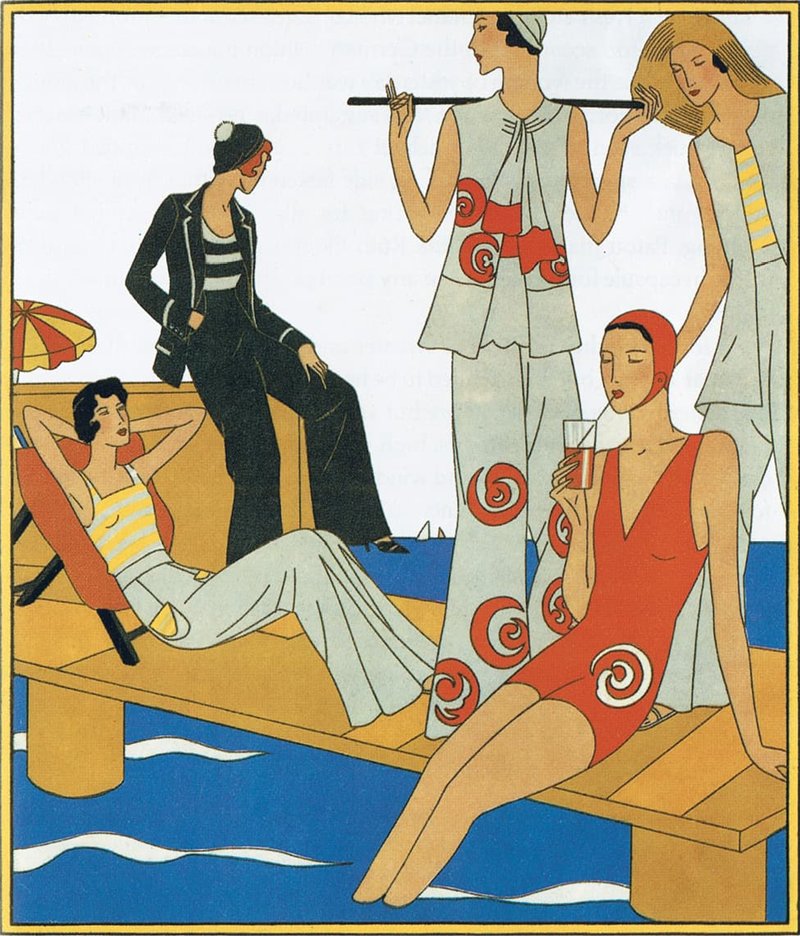 94 Стильные модели пляжной одежды лета 1931 года от парижских модных домов: брюки, блейзер и полосатый трикотажный ансамбль – элементы мужского гардероба проникают в женскую моду.