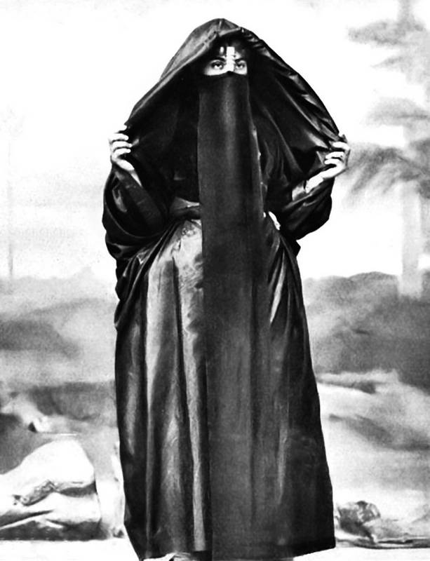 Из всех роскошных арабских и турецких костюмов, уцелевших после реформы, особенно причудливы наряды женщин, они-то и придают толпе, запрудившей улицы, вид костюмированного шествия. Меняются лишь цвета домино – от синего к черному. Знатные дамы носят хабару из легкой тафты, а женщины из простонародья грациозно драпируются в синюю шерстяную или хлопчатобумажную тунику (камис) наподобие античных статуй. Какую волю воображению дают эти недоступные взору женские лица, к счастью, только лица… Прекрасные пальчики, унизанные кольцами-талисманами, запястья в серебряных браслетах, а то и точеная, словно из мрамора, рука выглядывают из-под широких, поднятых до плеч рукавов; браслеты на щиколотках серебристо позвякивают, и при каждом шаге слетают с ног бабуши; этим можно любоваться, это можно угадать или подсмотреть, не вызывая недовольства толпы и, кажется, не привлекая внимания самой женщины. Иногда развевающееся покрывало в сине-белую клетку, накинутое на голову и плечи, слегка приподнимается, и в просвет, образованный между покрывалом и удлиненной маской, именуемой буркуа, можно разглядеть изящный висок с тугими локонами темных волос, совсем как на изображениях Клеопатры, крохотное ушко, в которое вдеты гроздья золотых цехинов или пластинки, украшенные бирюзой или серебряной филигранью, раскачиваясь, они задевают шею и щеки. В этот миг испытываешь настоятельную потребность заглянуть в глаза закутанной в покрывало египтянке, и это самое опасное желание. Буркуа сделана из длинного узкого куска черной материи, сотканной из конского волоса, в нем оставлены два отверстия для глаз, как в разбойничьей маске; несколько блестящих, нанизанных одно на другое колечек соединяют полоску на лбу с нижней частью маски; за этой преградой вас подстерегают горящие глаза, владеющие всем арсеналом средств обольщения. Брови, глазные впадины, веки оживлены краской, невозможно выгоднее представить то немногое, что дозволено обнажать местным женщинам.