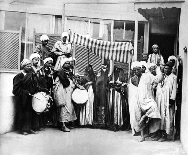 Через дверь, увитую цветами и листьями, мы вошли в очень красивый двор, разукрашенный цветными фонариками. На оранжевом фоне окон, за которыми толпились гости, вырисовывалось причудливое кружево машрабийи. Пришлось остановиться и занять место во внутренней галерее. В дом поднимались только женщины, там они снимали покрывала, и через деревянные точеные решетки окон можно было видеть лишь расплывчатые контуры, блеск ярких костюмов и украшений.