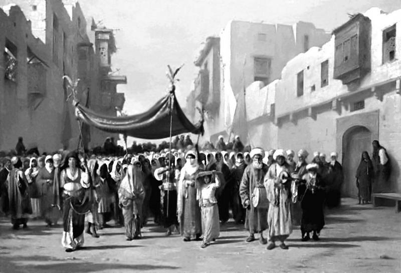 Процессия двигалась очень медленно под звуки музыки, имитирующей назойливый скрип двери или скрежет немазаной телеги. Виновники этого шума – человек двадцать – шли в окружении мужчин, которые несли факелы на длинных шестах. Их сопровождали дети с большими, тяжелыми канделябрами со свечами, отбрасывающими яркие блики. Каждый раз, когда процессия останавливалась, борцы продолжали разыгрывать поединки; некоторые из них, с перьями на голове, встав на ходули, дрались на длинных палках; поодаль юноши несли флаги и позолоченные значки на древках, как это было принято на триумфальных шествиях у римлян, другие держали небольшие деревца, украшенные гирляндами и венками, сверкающие мишурой и горящими свечами, словно рождественская елка. На длинных шестах были прикреплены пластины с чеканным орнаментом, испещренные надписями, в них отражались отблески света. Затем шли певицы (альмеи) и танцовщицы (газийи), одетые в шелковые полосатые платья, в тарбушах с золотой макушкой; в их длинные косы были вплетены цехины. У некоторых в носу были продеты большие кольца, они не прятали своих лиц, раскрашенных красной и синей красками, зато другие, хотя тоже пели и плясали, тщательно кутались в покрывала. Им аккомпанировали на цимбалах, кастаньетах и барабанах. За ними в две шеренги шли невольники с корзинами и сундуками – подарками невесте от жениха и его семьи; потом шествовали гости: посредине женщины, тщательно задрапированные в черные покрывала, лица их были скрыты белыми масками, как это принято у знати; мужчины в дорогих одеждах – в такой день, объяснял мне драгоман, даже самые простые феллахи[4] достают себе подобающие случаю костюмы. Наконец, в ослепительном зареве факелов, свечей, миш'алей (сосудов, наполненных ярко горящим деревом) стал медленно приближаться красный призрак, который я уже видел издали, – невеста (алъ-аруса) в длинной прозрачной кашемировой шали, спускающейся до пят; невеста, оставаясь невидимой для окружающих, сама могла все рассмотреть. Что за странное зрелище эта длинная фигура под ниспадающим складками покрывалом! Она казалась еще выше из-за диадемы пирамидальной формы, сверкающей драгоценными камнями. Ее поддерживали под локти две одетые в черное матроны; создавалось впечатление, что она скользит по земле; четверо рабов несли над ней пурпурный балдахин, а другие сопровождали шествие игрой на инструментах, напоминающих цимбалы (сантир) и гусли (канун).