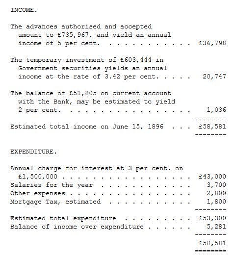 A similar uncertainty prevails in regard to the more recent attempts to place cheap money within the reach of settlers. The first step in that direction was taken in 1886, when regulations were made for the establishment of Village Settlements, the members of which might receive loans for the construction of their houses and for other purposes. These settlements were not, as in some of the Australian Provinces, formed on a co-operative or a semi-communistic basis. The success of this experiment doubtless encouraged the Government to widen the scope of the advances. In 1895, 4,560 persons, divided among 144 settlements, had occupied 33,800 acres of land; they had received £25,800 in advances, had paid £17,600 in rent and interest, and had carried out improvements of the value of £92,800. These improvements, consequently, form an ample security for the repayment of the loans. The necessity of a general scheme of advances was based upon the difficulty experienced by small settlers, however good might be the security, in obtaining loans except at prohibitive rates. Authority was, accordingly, obtained through the Government Advances to Settlers Acts of 1894-6 to borrow three millions with a view to loans ranging from £25 to £3,000, upon first mortgages, to owners of freehold land and occupiers of Crown Lands, the advances not to exceed three-fifths of the value of the former and one-half of the value of the lessee's interest in the latter. Advances may not be made on town lands, nor on suburban lands which are held for residential or manufacturing purposes. The valuation of every security is to be carried out by or on behalf of a superintendent appointed ad hoc., and is to be submitted for the consideration of a General Board consisting of the Colonial Treasurer, the Superintendent, the Public Trustee, the Commissioner of Taxes, and a nominee of the Governor in Council. The advances on freehold land may be either for a fixed period at 5 per cent., or for 36-½ years at 6 per cent., of which 5 per cent. is reckoned as interest and 1 per cent. towards the gradual repayment of the principal; on leasehold lands, in the latter form alone. As the loan of a million and a half raised as the source of advances was floated at 3 per cent., and realised nearly £1,400,000, the margin between the percentage due by the Government and that received from the settlers should be sufficient to enable one-tenth of the interest to be paid, as provided, into an Assurance Fund against possible losses, and a residue to be available which will cover the general expenses of administration. But it is obvious that the result of the experiment will depend greatly upon the prevalent rate of interest and the price of produce. Hitherto, two-thirds of the advances have been used by settlers to enable them to rid themselves of former and less advantageous mortgages; in some cases, mortgagees, in order to retain their mortgages, have voluntarily lowered the rate of interest to 5 per cent. The tabular statement on the following page of the financial position is the latest that has been issued, and does not purport to be more than approximately correct. Advances may also be made towards the construction of dwelling-houses to those who have obtained selections under the Land for Settlements Acts; but they may not exceed twenty pounds nor the amount already spent by the applicant upon his holding.