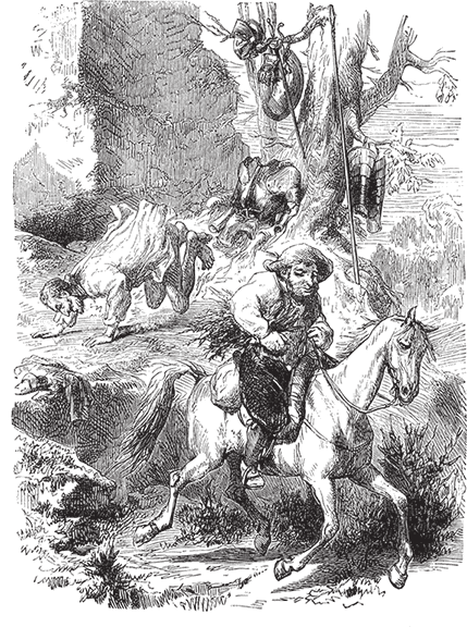 Поспешно раздевшись до рубашки, наш рыцарь без долгих предисловий проделал два прыжка, а потом перекувыркнулся раза два через голову. Для Санчо этого было вполне достаточно; не желая видеть дальнейших проделок своего господина, он повернул Росинанта и поспешно отправился в путь.