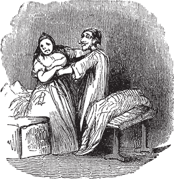На беду, Мариторнес понадобилось что-то на чердаке. Осторожно, стараясь не шуметь, она поднялась наверх. Но едва она переступила порог, как Дон Кихот, заслышав ее шаги, присел на кровати и стал ждать ее приближения. Пробираясь в темноте, астурийка действительно чуть не наткнулась на его кровать, и наш благородный кабальеро успел схватить ее за руку. Испуганная Мариторнес тщетно пыталась вырваться, но Дон Кихот усадил ее на край своей кровати и тихо и нежно произнес: