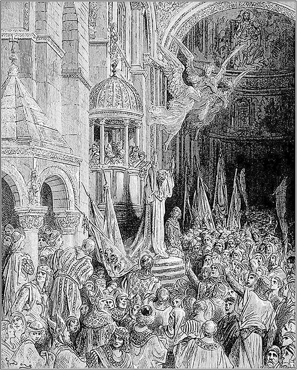 Так он прибыл на совет, который назначен был в Суассоне[136], и было там великое скопление графов, баронов и крестоносцев. Когда они узнали, что маркиз прибыл, то выехали ему навстречу и воздали ему великие почести. Наутро состоялся совет в винограднике аббатства госпожи Св. Марии Суассонской[137]. Там они склоняли маркиза принять то, за чем его призвали, и умоляли его, Бога ради, взять крест, и согласиться предводительствовать войском, и заступить место Тибо Шампанского, и взять его деньги[138]. И все они припали к его стопам, обливаясь слезами. И он также припал к их стопам и сказал, что сделает это весьма охотно.
