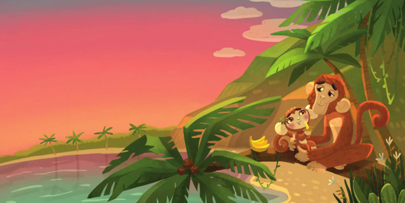 Обезьянка открыла глазки и сладко потянулась. Затем встала, сорвала сочных зелёных листьев с ветки, на которой спала, перепрыгнула на другую, где сидели мама с папой, и подарила маме букетик.