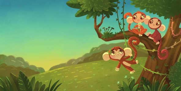 И вот три обезьянки отправились к Большой Горе. Перепрыгивая с дерева на дерево, они рассказывали друг другу разные истории, шутили и смеялись. Им всегда было весело вместе.