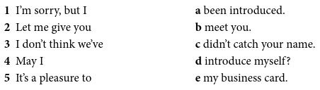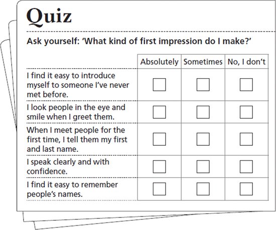At conferences, networking events and even in the office – wherever you do business – you will meet new people. How do you make a good first impression? A warm, friendly greeting will help you. Using small talk to start a conversation will help too. Try to make sure that people remember you and try to remember them too. You might not hear their name properly the first time, and in this chapter you will learn how to ask people to repeat their name.