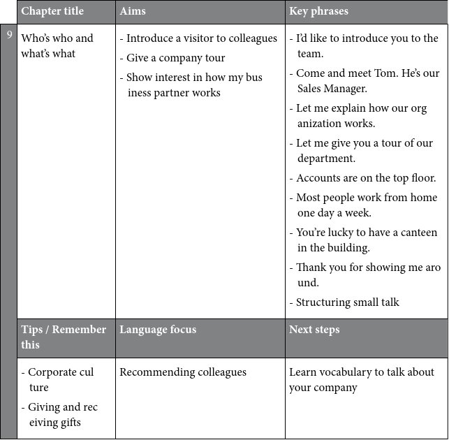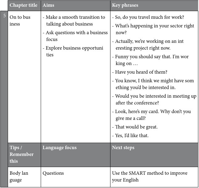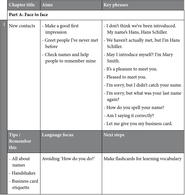 This book can be used as a self-study guide or as part of a course. Work through each chapter in order or refer to a specific chapter before you go to a conference, to a meeting or to the office of a business partner and focus on the key phrases you will need. Use the book as a resource when you know you will have the opportunity to meet people and to make small talk in English.