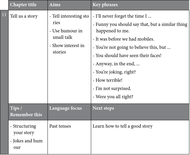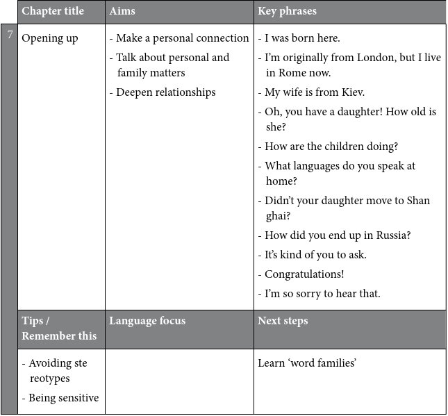Each chapter focuses on one area of small talk. This section sets the scene and tells you what to look out for.