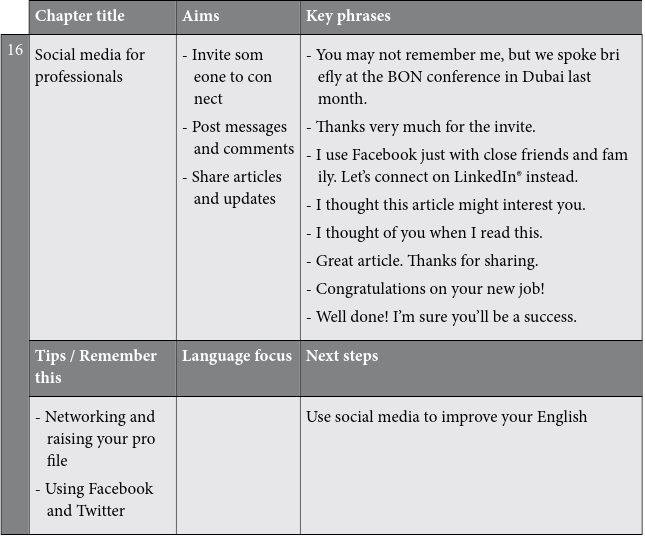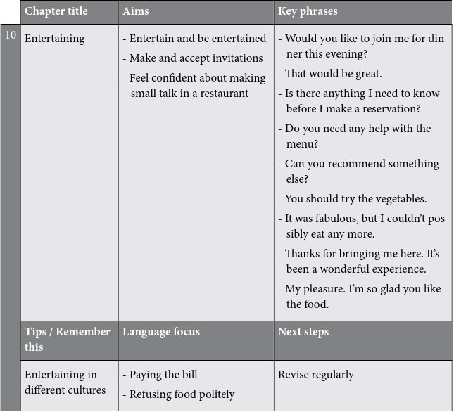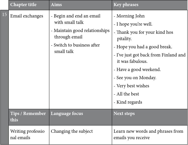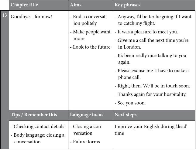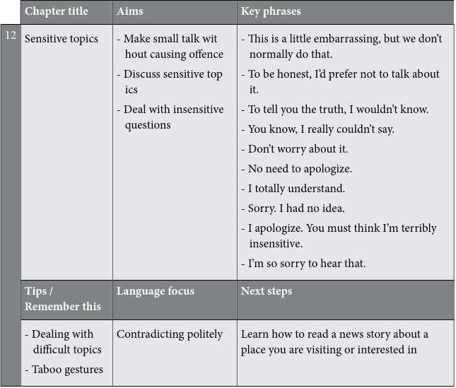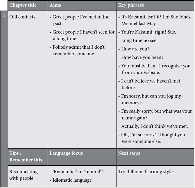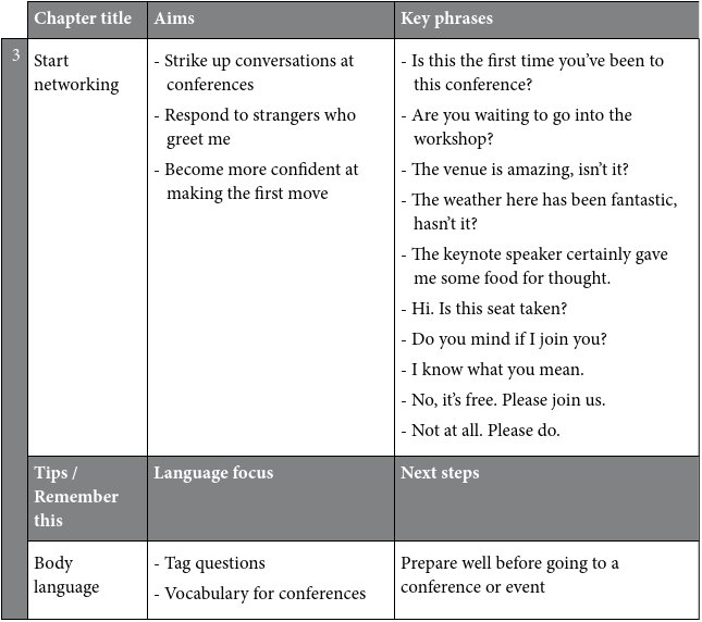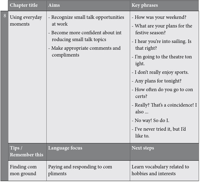 The key phrases are a vital section of each chapter. These are common phrases that you should learn because they will give you the confidence to deal with many kinds of small talk situations. The key phrases are highlighted so that they are easy to find. For example, before you go to a networking event, you could look up the key phrases you would need to make small talk there.