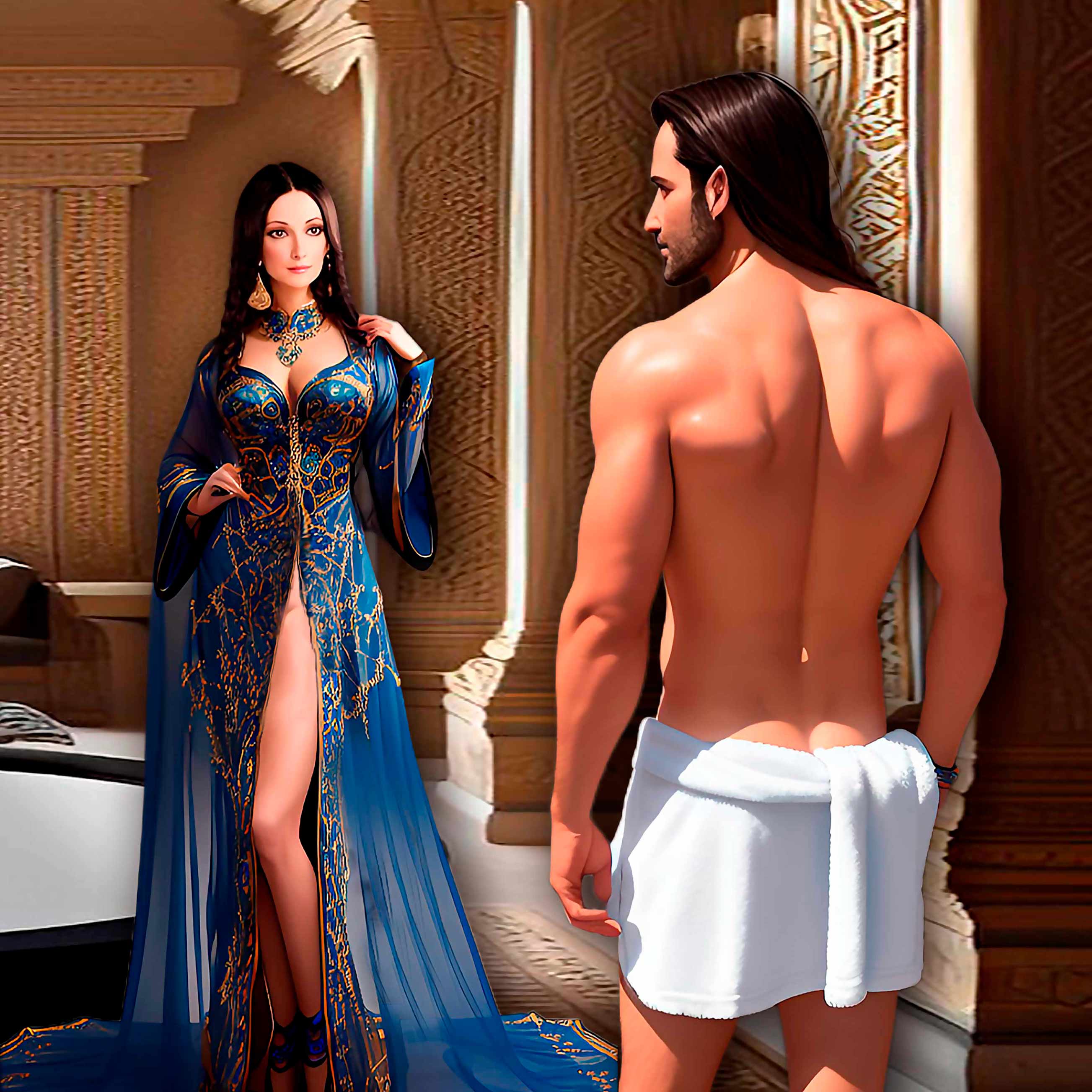 Они прошли по коридору совсем немного, и перед ними открылась дверь в стене. Зеро, быстро осмотрел не очень большое, но очень богатое помещение с обилием тауриновой ковкой и мелким маленьким бассейном. Взгляд сразу же выхватил стоящую у зеркала черноволосую женщину в голубой приталенной хоббе. Услышав шум открывающейся двери, она резко обернулась и, словно бы ужаснувшись увиденному, резко шагнула назад. Хобба, оказавшаяся не застегнутой, слегка распахнулась, обнажив полоску тела от подбородка до пола.