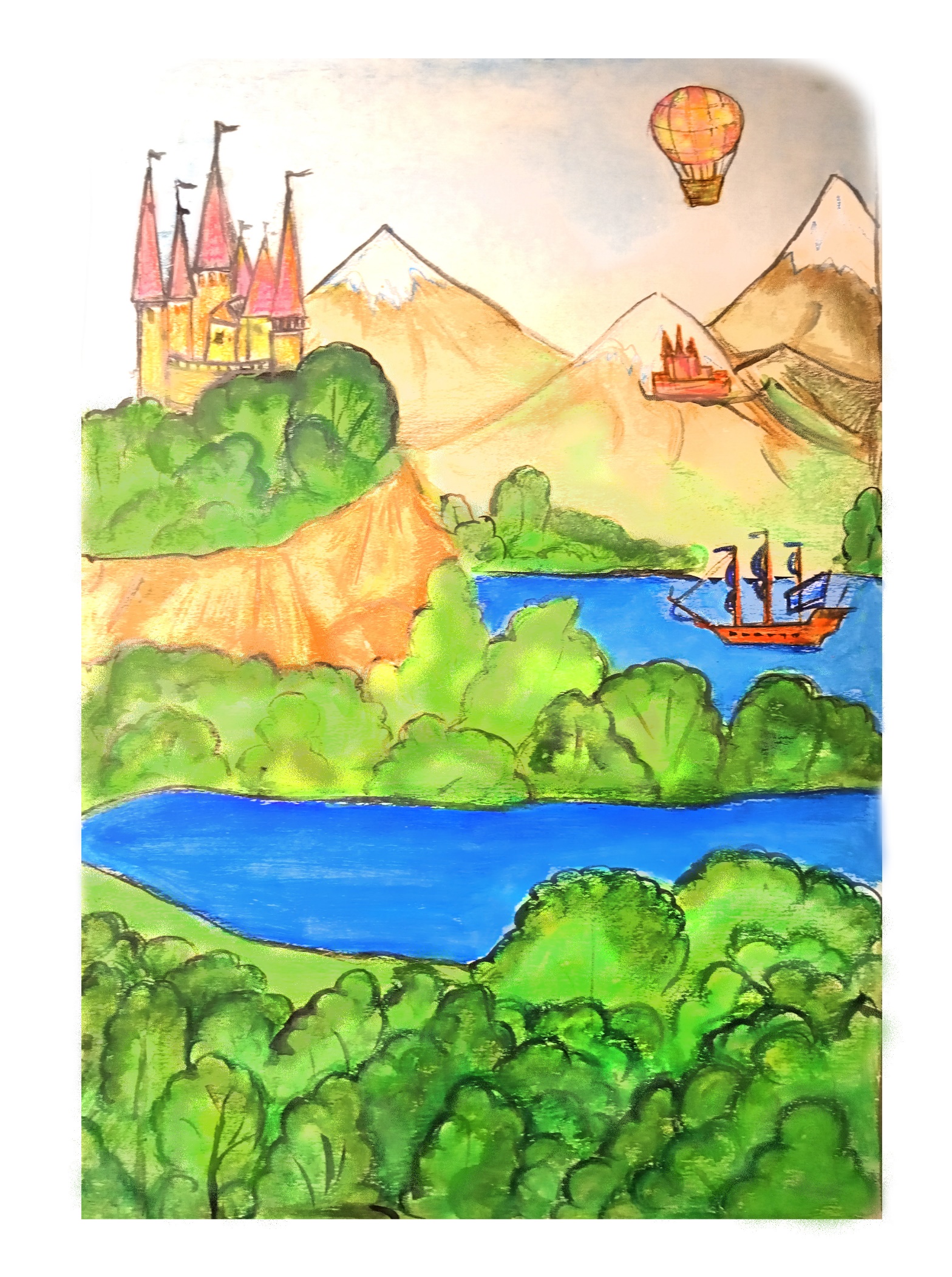 Под воздушным шаром раскинулась удивительная, сказочная страна. В ней были крутые горы, на склонах которых лепились замки с изящными, словно точёными башенками. С обрывов срывались нитки водопадов, переходя в змеящиеся по равнинам реки. Иногда блестели круглыми блюдцами лазурные озёра.