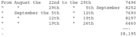 But to return to my particular observations during this dreadful part of the visitation. I am now come, as I have said, to the month of September, which was the most dreadful of its kind, I believe, that ever London saw; for, by all the accounts which I have seen of the preceding visitations which have been in London, nothing has been like it, the number in the weekly bill amounting to almost 40,000 from the 22nd of August to the 26th of September, being but five weeks. The particulars of the bills are as follows, viz.: —