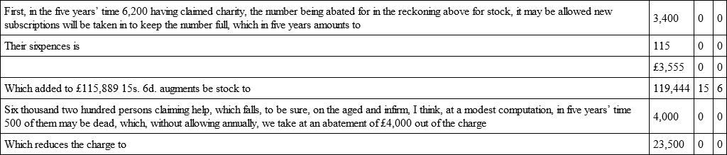 It is to be noted that the pensions I propose to be paid to persons claiming by the third, fifth, and sixth articles are thus: every person who paid 1s. quarterly shall receive 12d. weekly, and so in proportion every 12d. paid quarterly by any one person to receive so many shillings weekly, if they come to claim a pension.