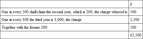Sir William Petty, in his “Political Arithmetic,” supposes not above one in forty to die per annum out of the whole number of people; and I can by no means allow that the circumstances of our claims will be as frequent as death, for these reasons: